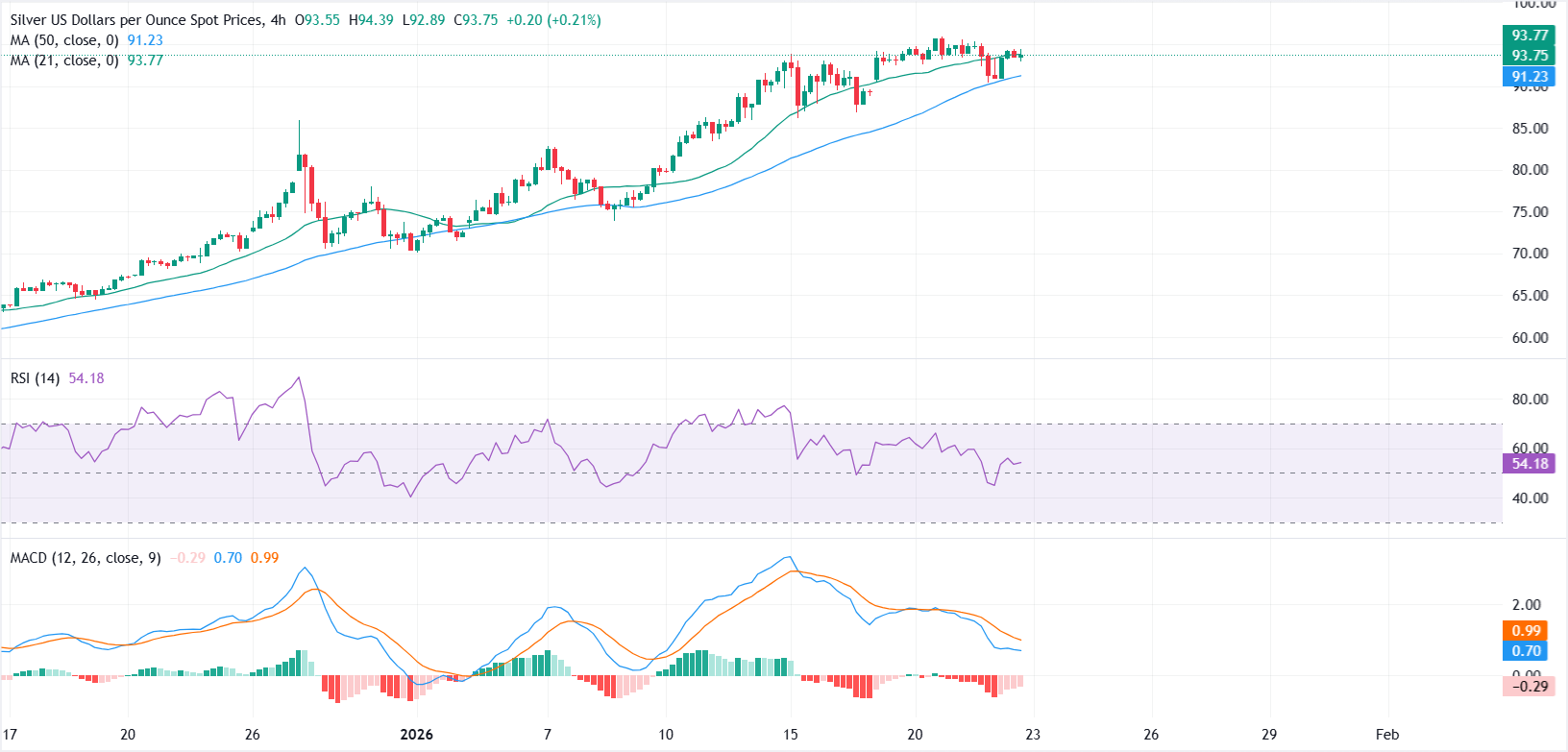 白银(XAG/USD)在周四恢复了一些涨幅,但缺乏后续动能,盘整于历史高位附近,因为风险情绪的适度改善抑制了避险资金流入。截至撰写时,XAG/USD的交易价格约为93.90美元,仍低于周二创下的接近95.89美元的历史高点