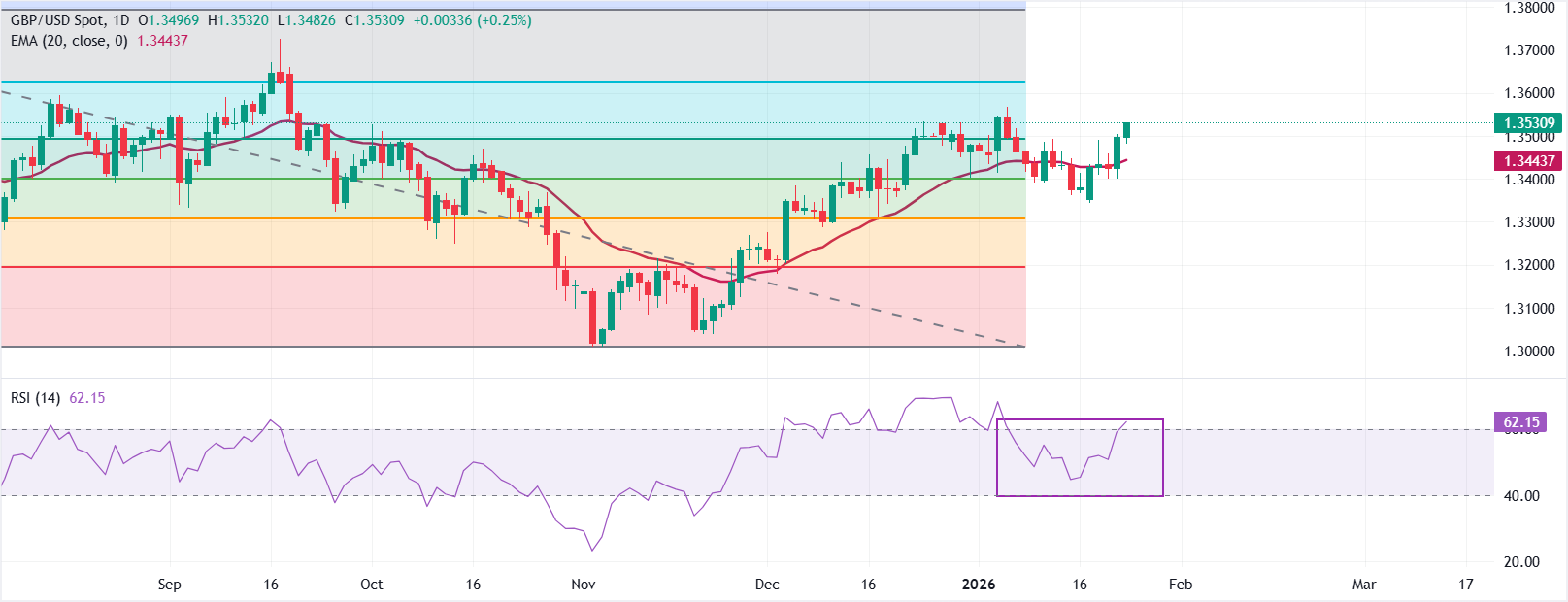 英镑(GBP)对主要货币强劲上涨,兑美元(USD)跳升至接近 1.3536,因为英国(UK)标准普尔全球采购经理人指数(PMI)1 月的初值数据强于预期,且 12 月零售销售恢复增长。