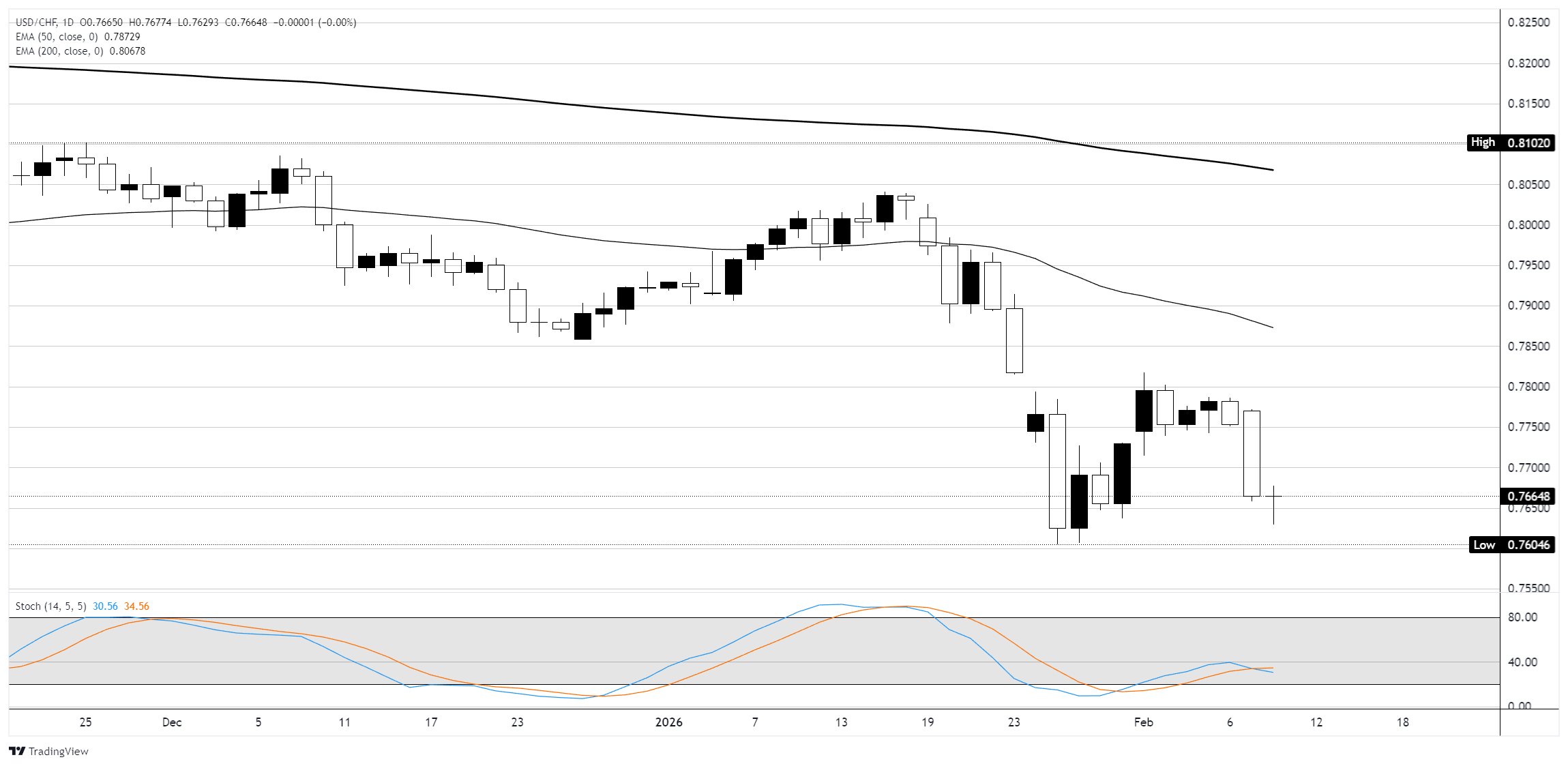 美元继续对瑞郎下滑,日图显示自2025年11月底接近0.8102的高点以来,形成了明显的下行趋势,表现为更低的高点和更低的低点