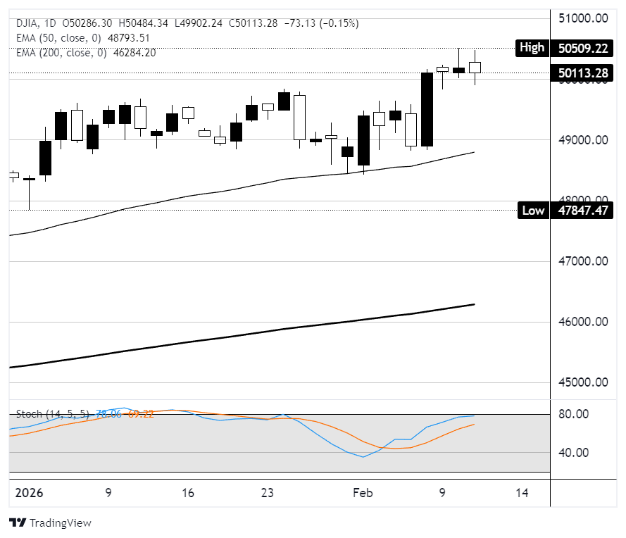 道琼斯工业平均指数(DJIA)在周三回吐早盘涨幅,跌约120点,收盘下跌约0.2%,接近50,010,在早盘交易中短暂重回50,000关口