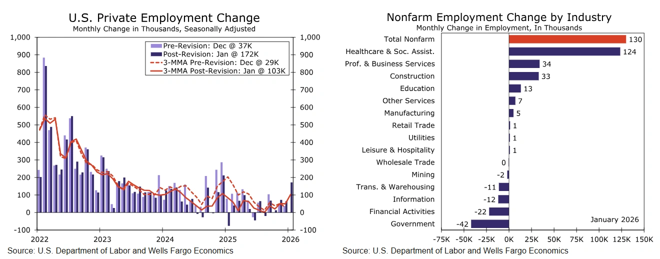 1月就业报告总体令人鼓舞。非农就业人数较彭博社6.5万人的共识预期实现翻倍,推动三个月平均就业增长步伐达到7.3万人,创下去年2月以来最强增速。失业率下降0.1个百分点至4.3%,重回2025年8月——即联邦公开市场委员会其后三次会议降息前——的水平。2024全年及2025年初的就业增长数据遭遇大幅下修,但此前已发布的QCEW数据已充分预示这一调整。今日报告中的成批修正对近期就业增长步伐影响相对较小。