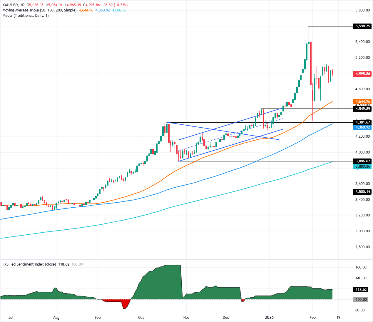 由于美国市场因总统日假期关闭,而中国的新年庆祝活动将使市场关闭超过一周,周一黄金价格在流动性稀缺的交易时段下跌近1%。截至发稿时,黄金/美元交易于4,992美元,此前触及日高5,054美元