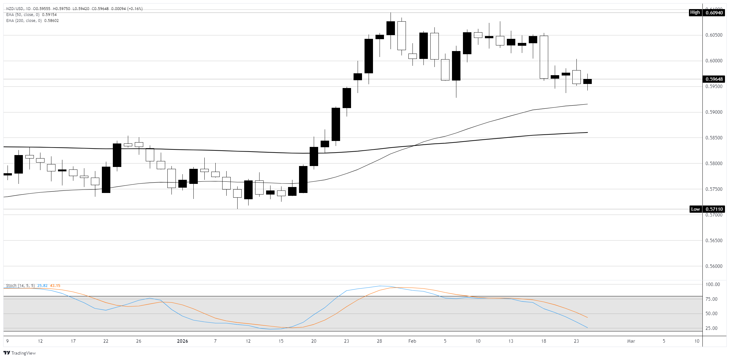 周二,纽元/美元下滑0.14%,收于接近0.5960的窄幅区间。该货币对交易于其关键移动平均线之上,但看涨动能已减弱