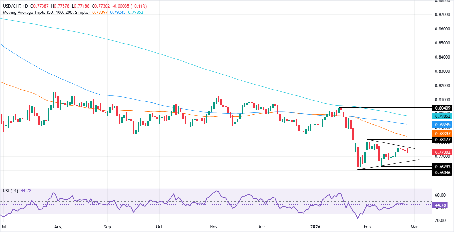 美元/瑞郎连续第四个交易日延续跌势,下跌0.14%,但在过去三天内仍局限于0.7718-0.7757区间。截至发稿时,交易价格为0.7729,位于20日简单移动均线(SMA)0.7726之上