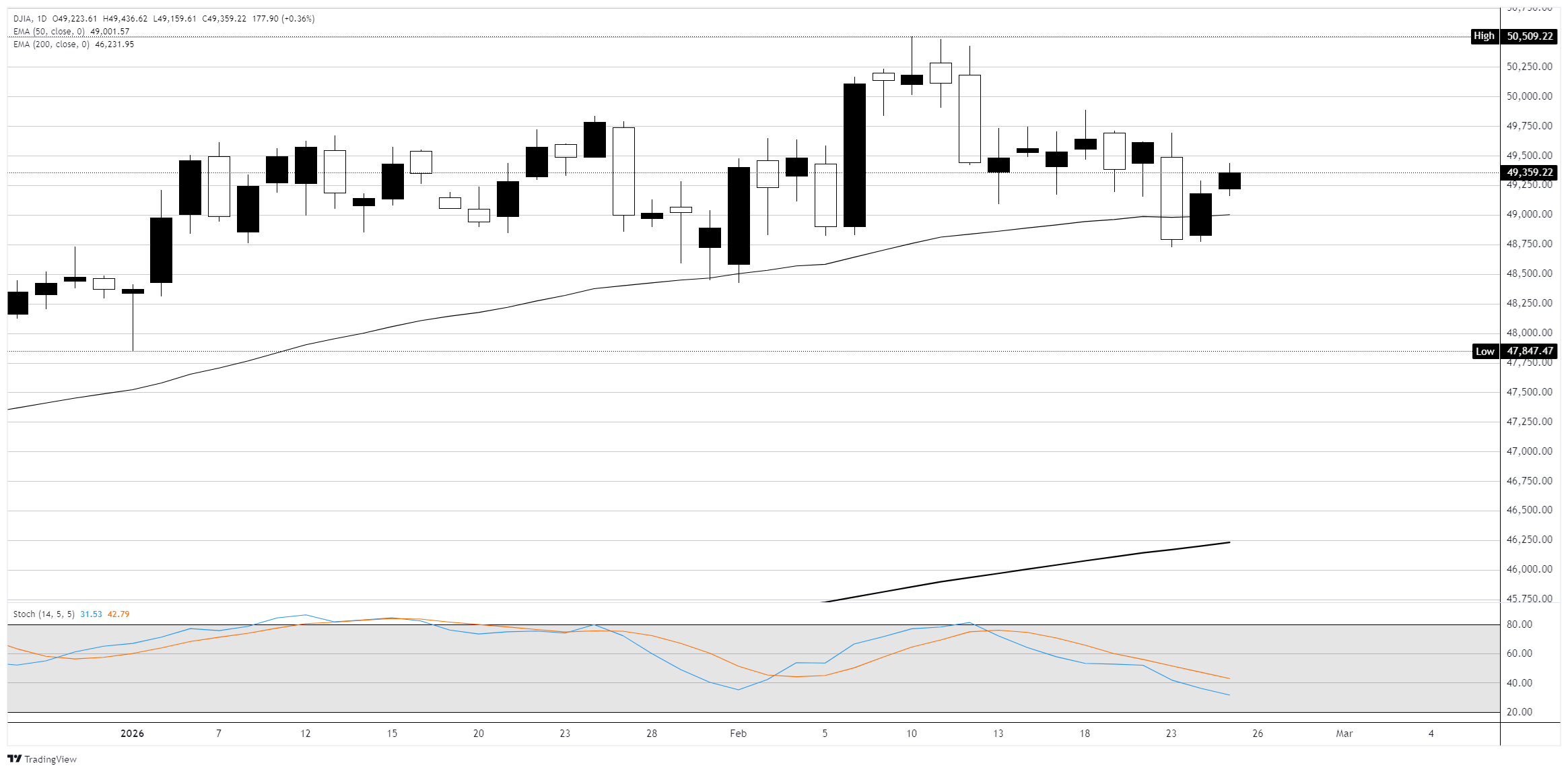 道琼斯工业平均指数(DJIA)上涨约200点,或0.4%,在周三再次挑战49,400区域,因为股市在英伟达备受期待的财年第四季度财报发布前交易谨慎看涨