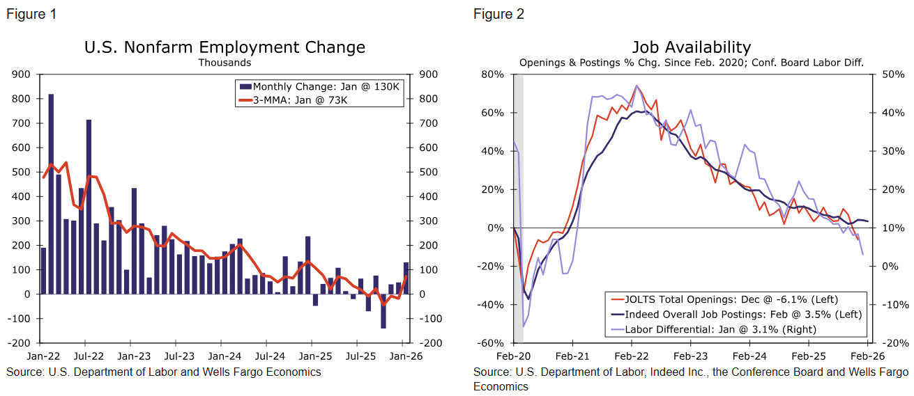 我们预计 2 月份的就业报告将显示 1 月份强劲的就业增长速度夸大了劳动市场的潜在动能。我们预计 2 月份非农就业人数将增加 45K,低于当前三个月平均增速 73K(图 1)。尽管劳动需求的某种稳定性显而易见,但包括 JOLTS 和消费者对职位可用性的看法在内的一系列指标,继续指向劳动市场条件的逐步放松,而不是招聘的重新加速(图 2)。