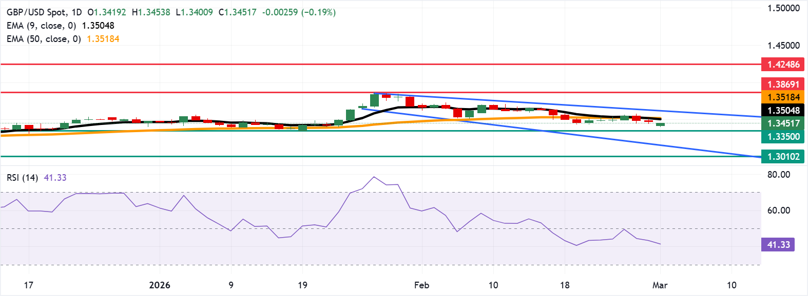 英镑/美元从日内亏损中反弹,周一亚洲时段交易在 1.3450 附近。日线图的技术分析显示出持续的看跌偏向,因为该货币对在下降通道模式中交易。