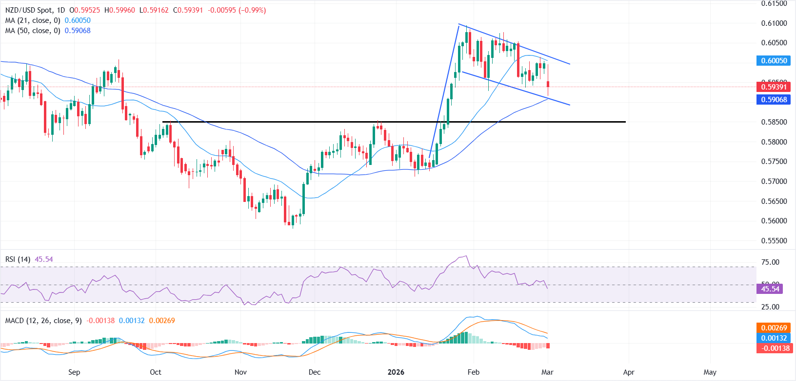 周一,纽元/美元在压力下交易,因为在中东地缘政治紧张局势升级的背景下,纽元(NZD)对美元(USD)走弱