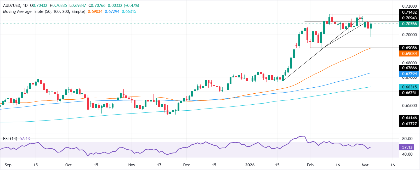 澳元/美元逆转了走势,周三上涨约0.61%,因市场情绪改善,受到强劲美国经济数据的支持,美元仍处于弱势。撰写时,该货币对交易于0.7077,准备接近当天的高点。