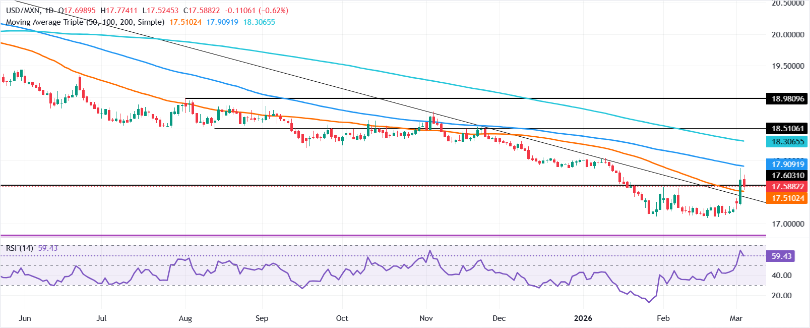 由于风险偏好的改善,尽管中东地区的敌对行动已持续第五天,墨西哥比索在周三恢复了一些涨幅。强劲的美国经济数据被MXN多头忽视,美元/墨西哥比索交易于17.56,下跌0.74%