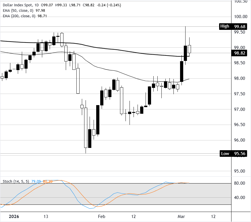 美元指数(DXY)周三下滑约0.18%,收于接近98.90,回撤自周二录得的99.68高点。