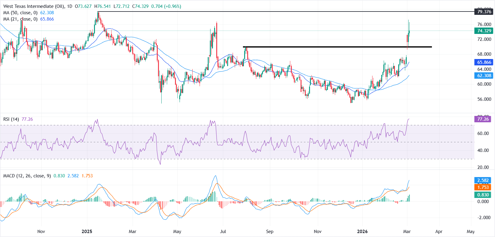 美国西德克萨斯中质原油(WTI)周三削减了部分日内涨幅,因为交易者评估围绕美伊冲突的地缘政治发展。截至发稿时,WTI 交易价格接近 74.32 美元,此前在周二短暂触及 77.20 美元的一年高点。