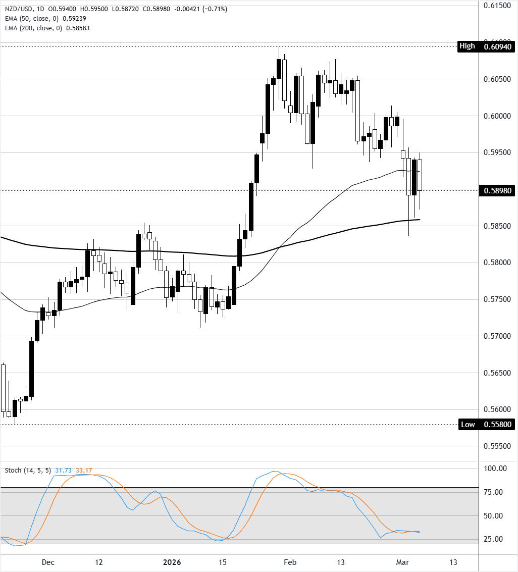 周四,纽元/美元下跌超过0.7%,收于接近0.5900,触及自1月底以来的最低水平。该货币对现在已回吐了大部分2月份的涨幅,自2月初在0.6090附近见顶以来,连续出现的低高点表明看涨动能正在减弱。