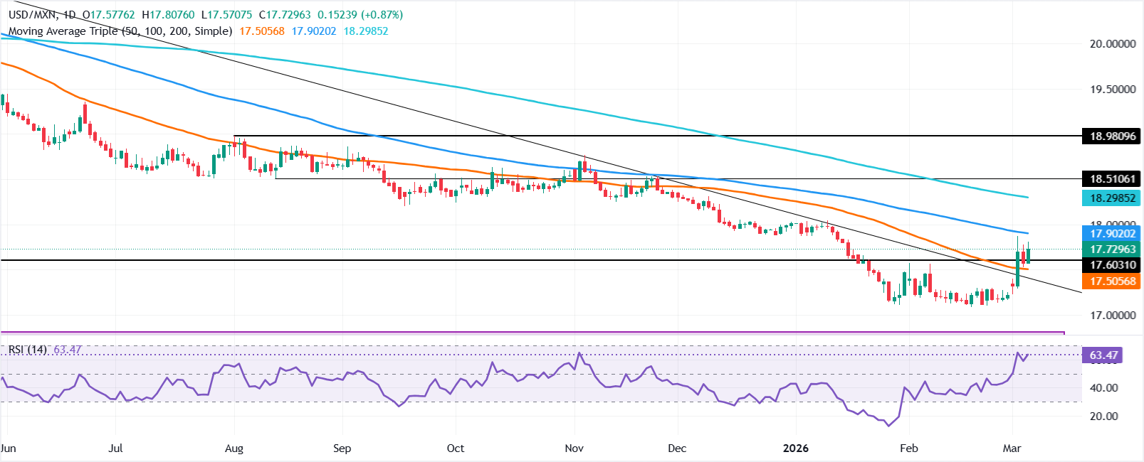 美元/墨西哥比索跳升至17.70以上,因中东战争引发风险规避