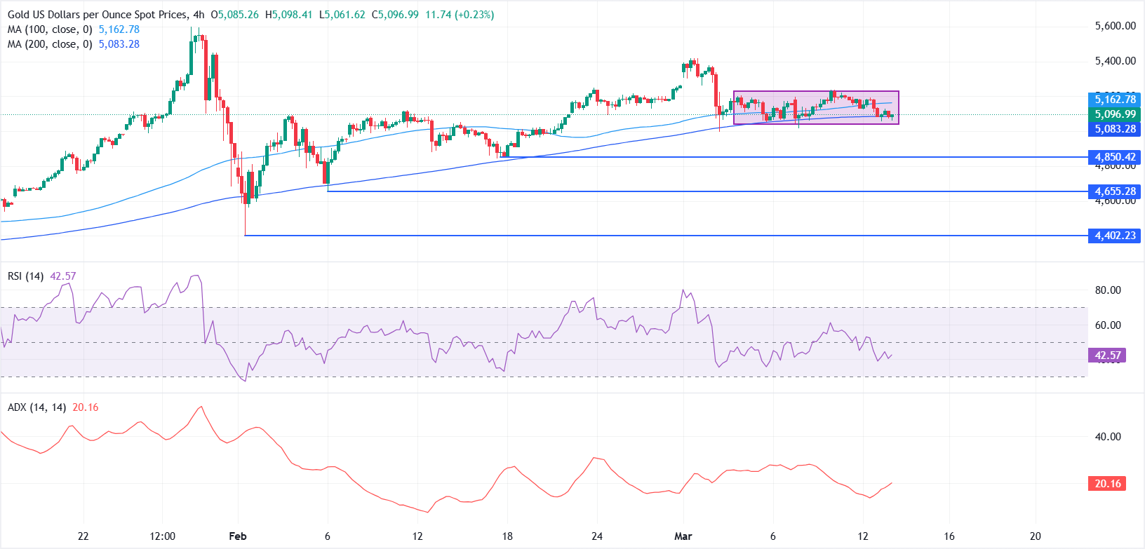 黄金(黄金/美元)在周五延续跌势,预计将迎来第二周的下跌,因为由于持续的美伊战争导致油价飙升,推动了通胀担忧,并引发了全球利率预期的鹰派重新定价,给这一无收益金属施加了压力