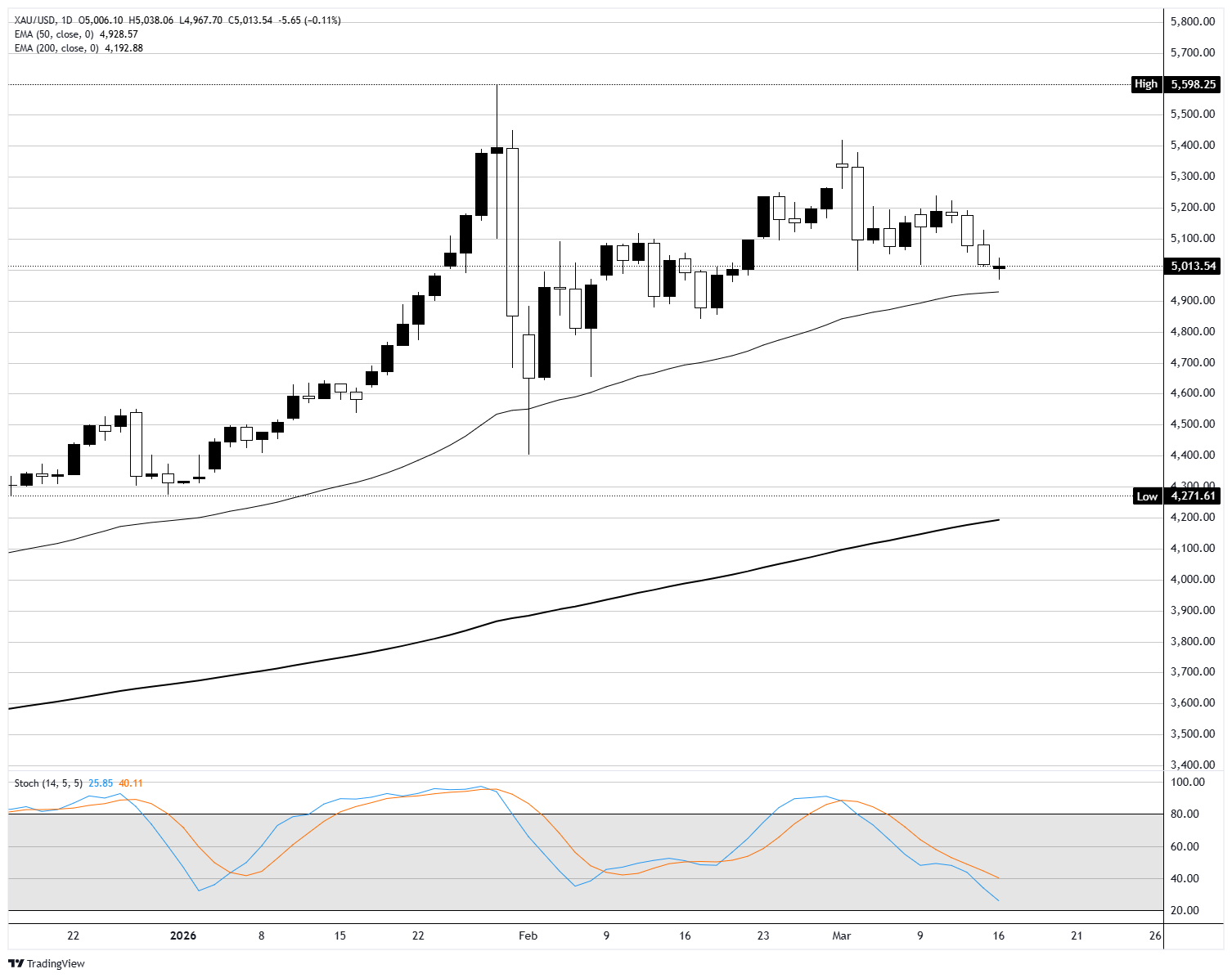 黄金(黄金/美元)周一在一个平坦的区间内波动,收盘接近5000,在经历了上周从高点急剧下跌后的相对平静的交易中。