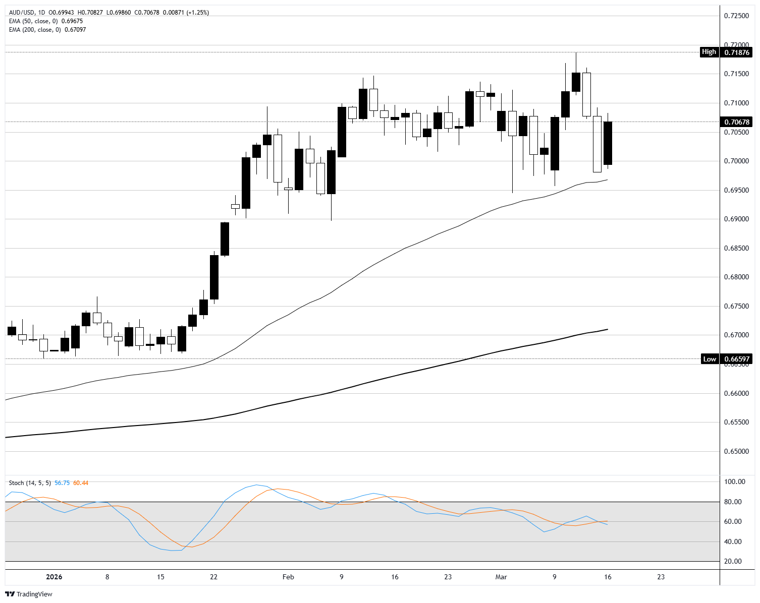 澳元/美元周一上涨约1.25%,从上周低点反弹,收于0.7070附近。自2月初接近0.7190的高点以来,该货币对一直处于波动区间,价格多次回撤至0.7000区域后再度反弹。