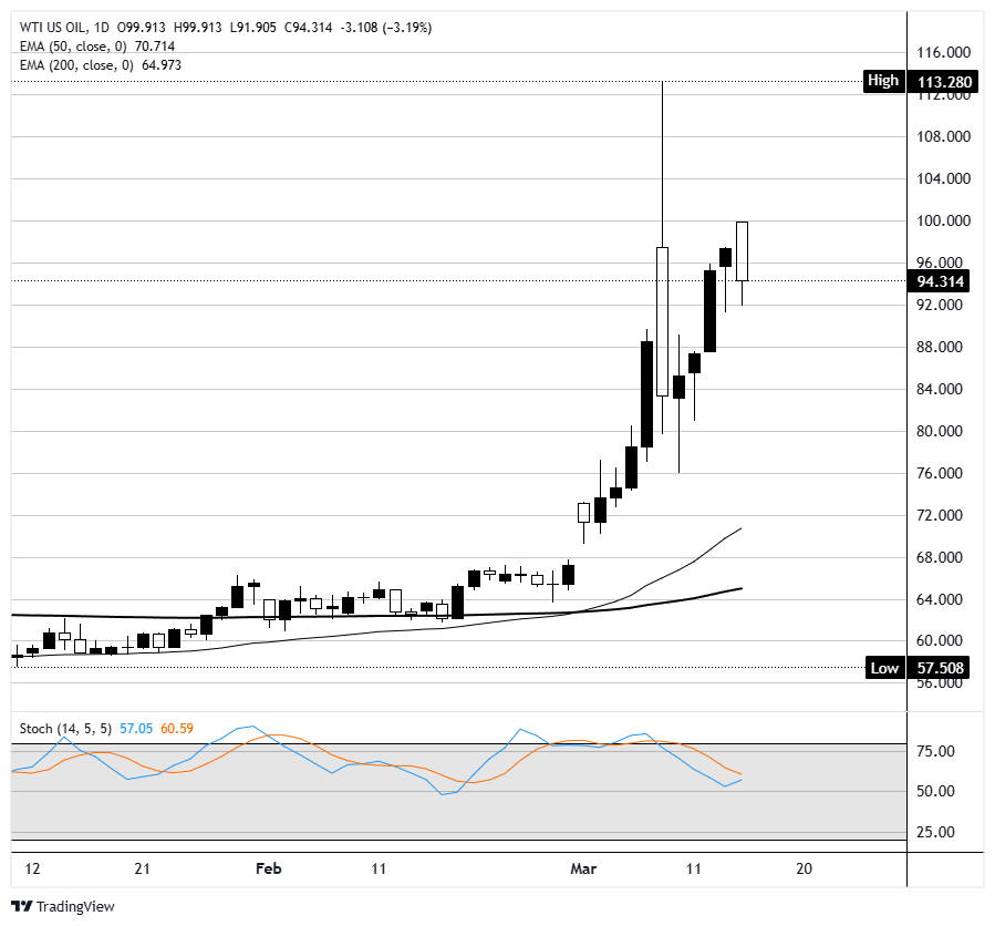 周一,西德克萨斯中质原油(WTI)价格下滑超过3%,开盘接近100.00美元,随后在交易过程中抛售,最终收于每桶95.00美元以下
