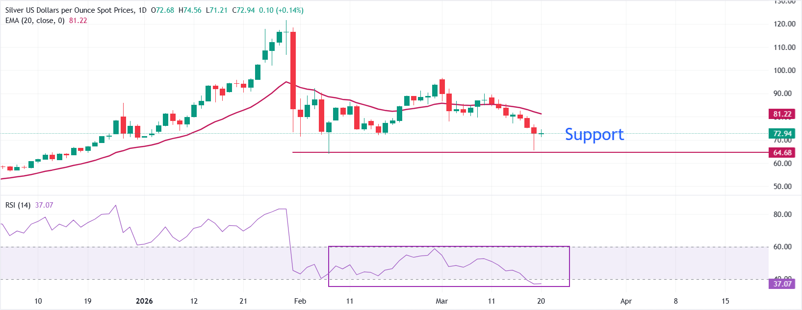 白银价格(XAG/USD)在周五欧洲交易时段于72.80美元附近窄幅波动。该贵金属维持了周四因美元(USD)走弱而推动的反弹走势。从技术面看,美元走低使白银价格成为投资者具有吸引力的风险回报交易品种。