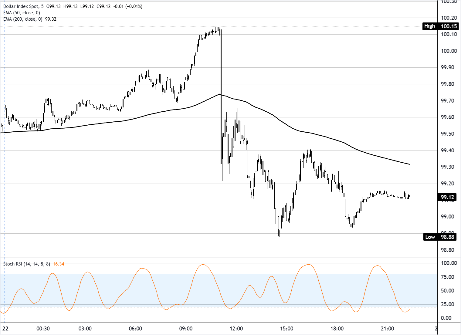 周一美元指数(DXY)波动剧烈,早盘因避险需求短暂突破 100.00 水平,触及时段高点 100.15 附近,随后急剧回落,收于约 99.12,当日下跌约 0.5%