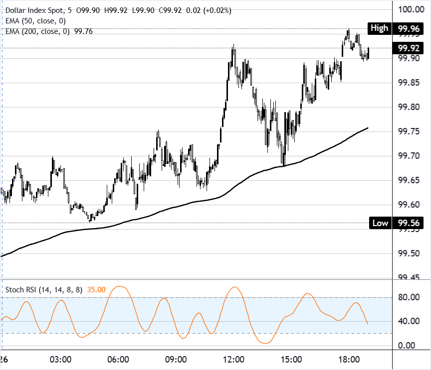美元指数(DXY)周四上涨约0.30%,从时段低点99.56附近攀升至接近99.90,美元连续第三个交易日吸引避险买盘。