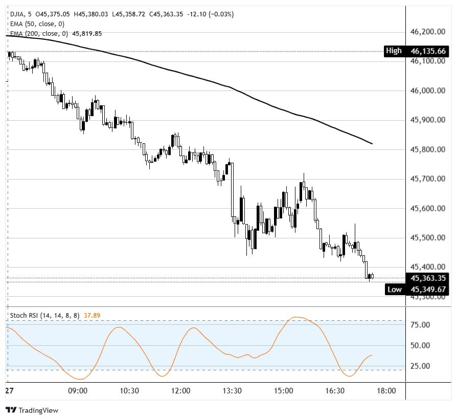 道琼斯工业平均指数(DJIA)周五大幅下跌,跌幅约为510点或1.1%,跌破45,500点,正式进入调整区间