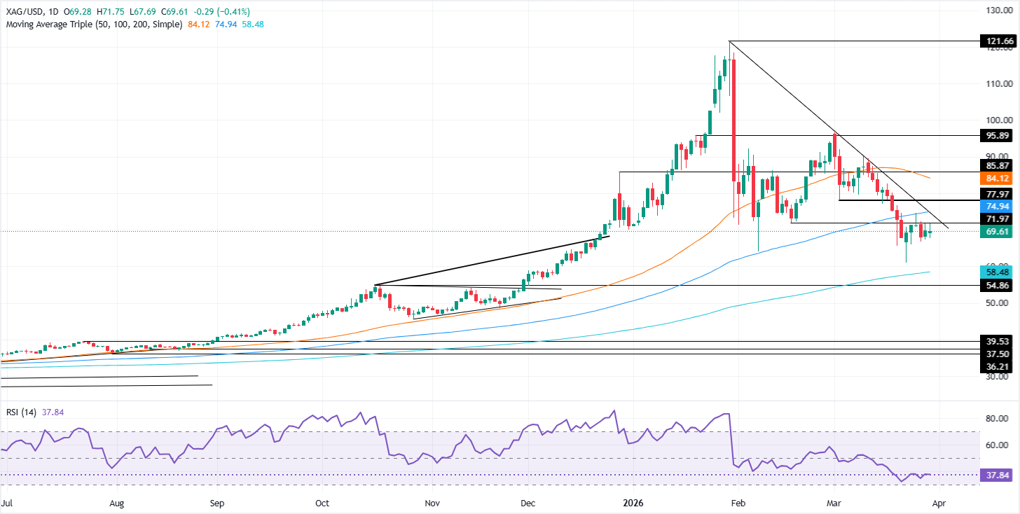 白银价格预测:白银/美元在70美元附近徘徊,受100日简单移动平均线限制