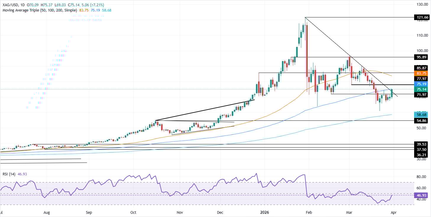 白银价格分析:白银/美元飙升,突破100日均线和75美元关口