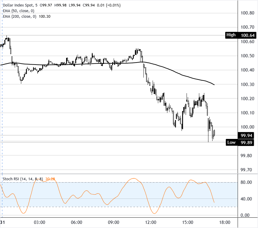 美元指数(DXY)周二下跌 0.50%,持续走低,首次跌破 100.00 关口,为自三月中旬以来首次,终结了连续五个交易日的上涨势头。