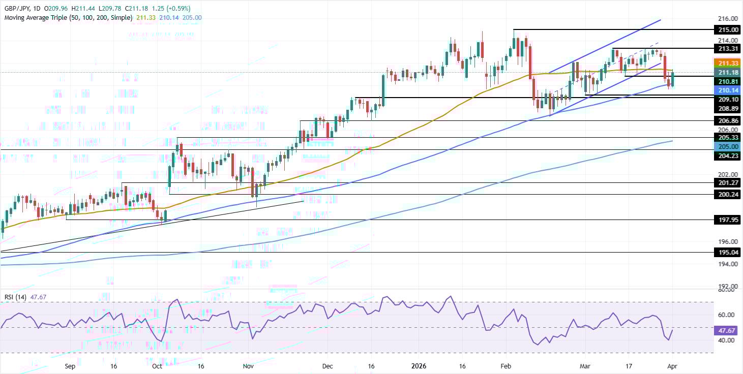 周三,随着市场情绪因伊朗战争可能结束的猜测而改善,英镑/日元上涨近0.60%。尽管该货币对在210.08的100日简单移动均线(SMA)处获得支撑,但在地缘政治不确定性中,市场情绪依然脆弱。