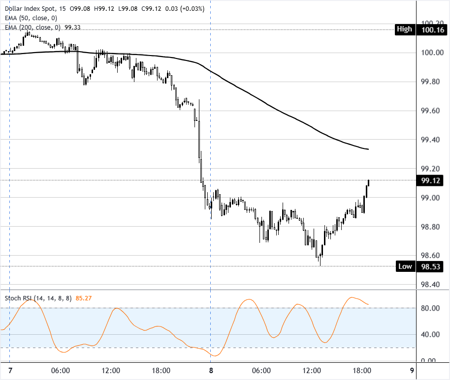 美元指数(DXY)在周三美国交易时段前半段继续缓慢下跌,较前一交易日接近100.00的收盘价下跌约1%,触及约98.50的低点,因美伊停火公告引发美元的广泛风险偏好抛售潮。