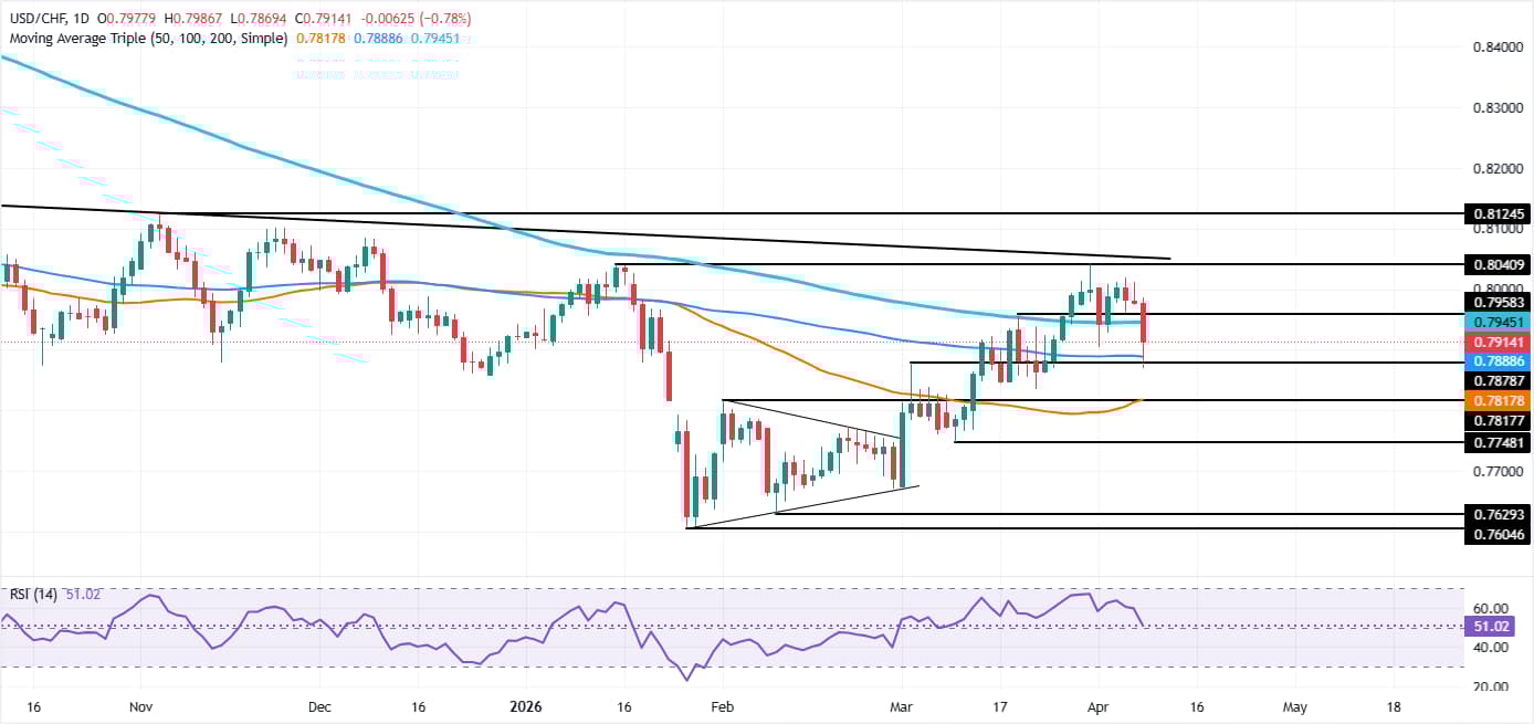 美元/瑞郎货币对周三回落约0.85%,未能突破周二的日高0.8011,且跌破200日简单移动均线(SMA)0.7940,因市场情绪因中东冲突两周停火而得到提振。