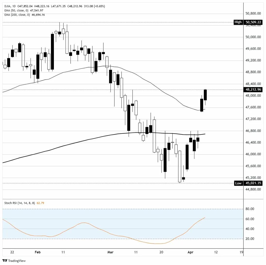 道琼斯工业平均指数(DJIA)周四上涨约300点,涨幅约为0.7%,延续了两天的反弹走势,指数从战争时期的低点大幅回升。标普500指数上涨0.6%,纳斯达克综合指数上涨0.7%,尽管对美伊两周停火协议持续性的怀疑加剧,风险偏好依然保持。