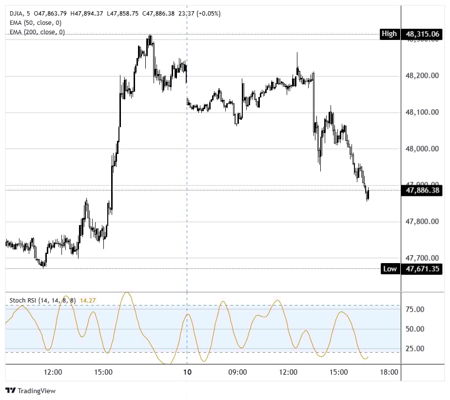道琼斯工业平均指数(DJIA)周五下跌约 300 点,跌幅约为 0.6%,从 48,000 点关口回落,此前连续两天因停火消息推动的涨势。
