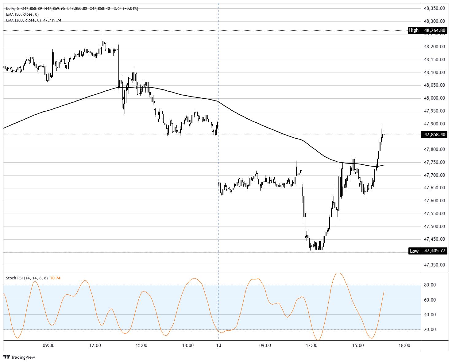 道琼斯工业平均指数(DJIA)周一小幅下跌,跌幅约为 50 点,报近 47,900 点,此前开盘时曾大幅下挫后回升。标普 500 指数上涨 0.2%,交易价位于 6,800 点以上,而纳斯达克综合指数上涨 0.6%,突破 23,000 点。