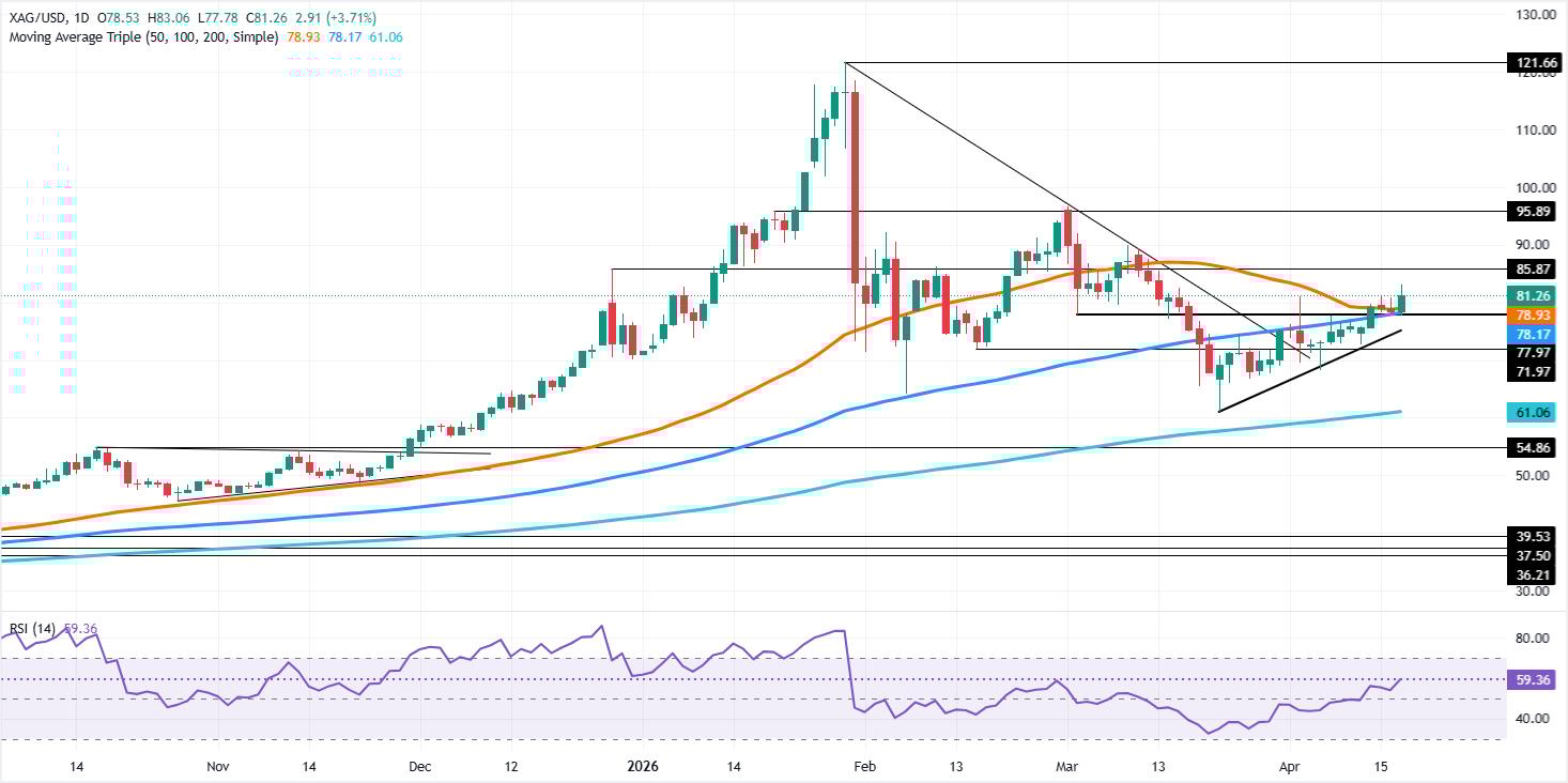 银价(白银/美元)周五飙升超过4%,收复至每盎司81.00美元,因美元在中东冲突利好消息影响下遭受重创。
