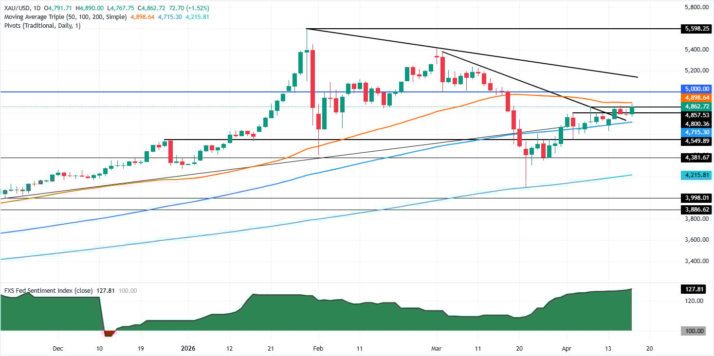 黄金(黄金/美元)价格在周五周末前上涨,突破 4850 美元水平,涨幅超过 1.50%,因伊朗重新开放霍尔木兹海峡,缓解了全球通胀压力,美伊冲突似乎正在降级。