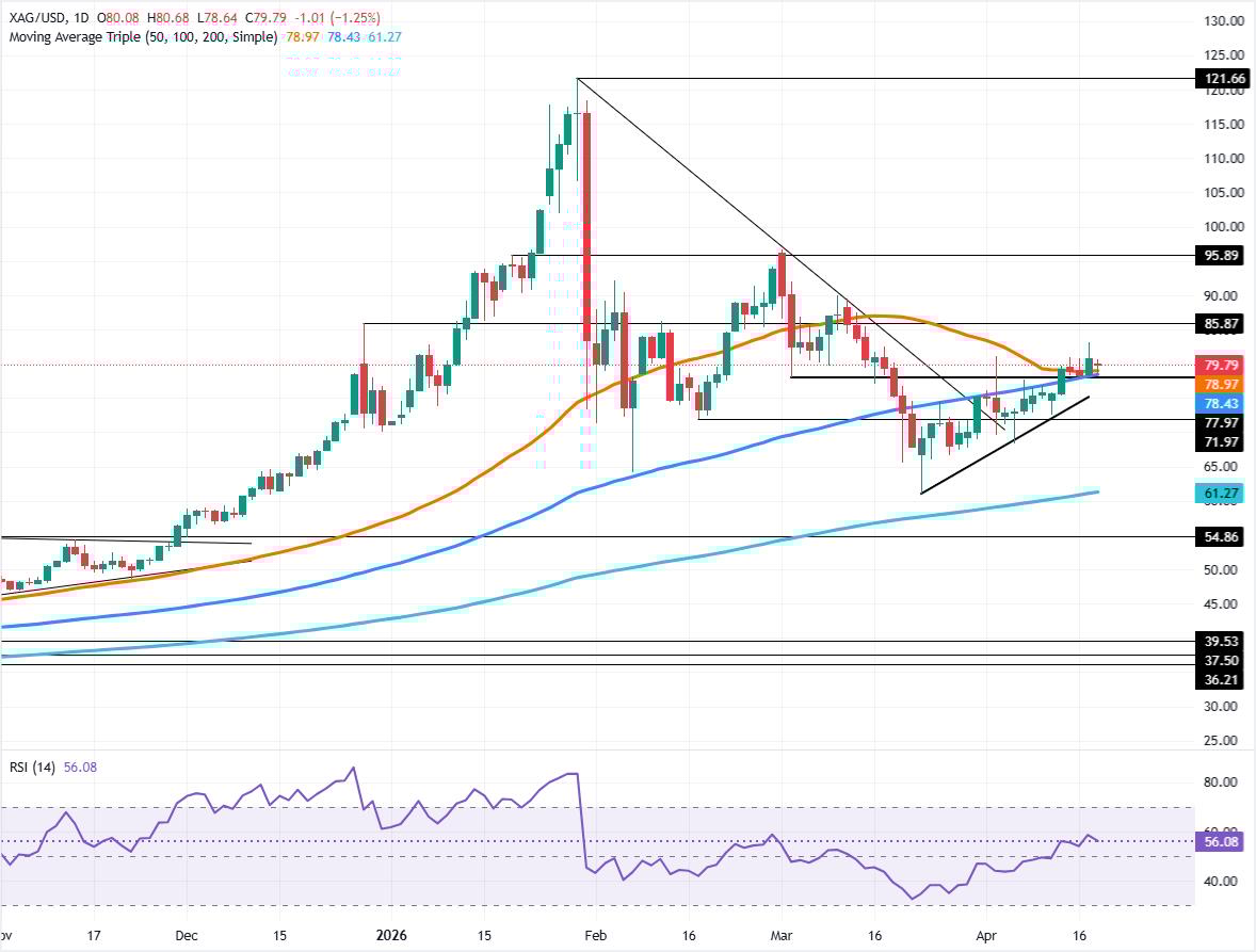 白银价格分析:白银/美元在80美元处停滞,十字星暗示潜在下行风险