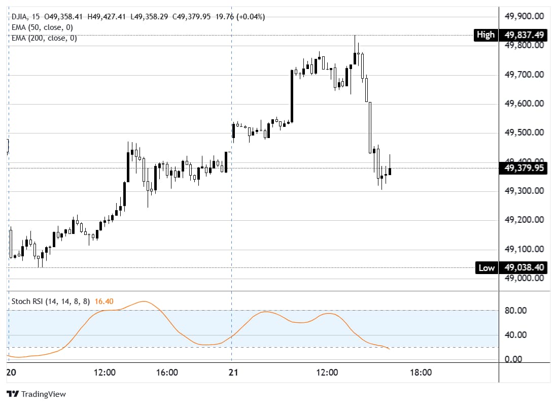 道琼斯工业平均指数(DJIA)期货在周二交易时段回落,合约一度创下接近49,800的隔夜新高后急剧回调,因交易员消化了三项高于预期的美国零售销售数据以及美联储(Fed)主席提名人凯的鹰派证词