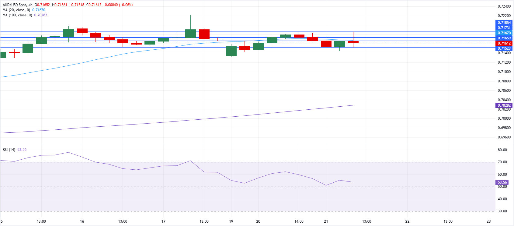 周二,澳元/美元跌至0.7160附近,保持建设性走势,因美元(USD)在风险情绪动荡中获得动能。