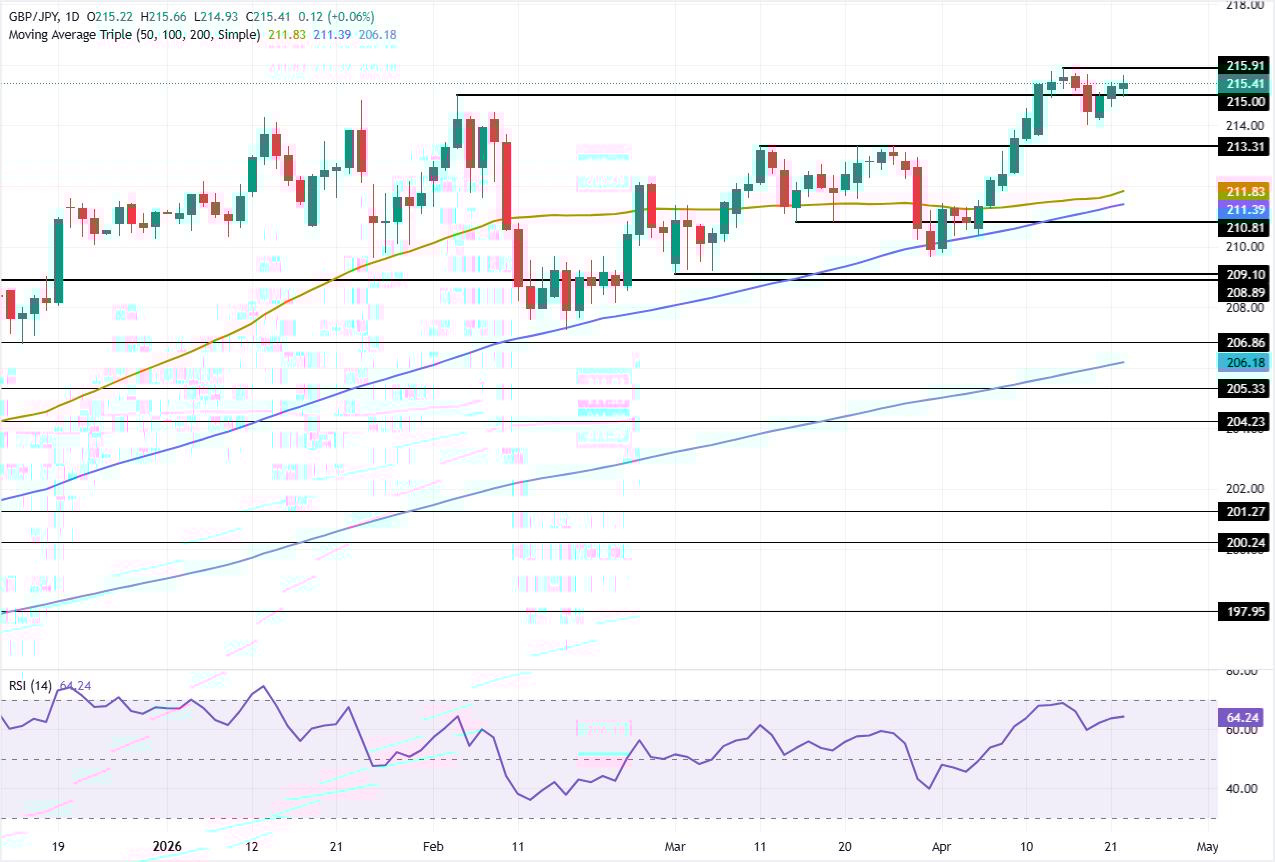 英镑/日元价格预测:英镑在215.00上方持稳,动能减弱