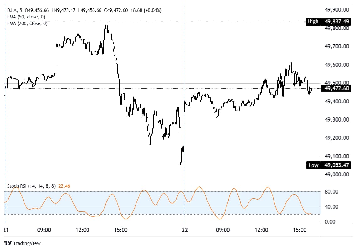 道琼斯工业平均指数期货在周三美国交易时段转为上涨,合约从隔夜低点49,100以下回升,随着风险偏好恢复,交易回升至49,500附近。