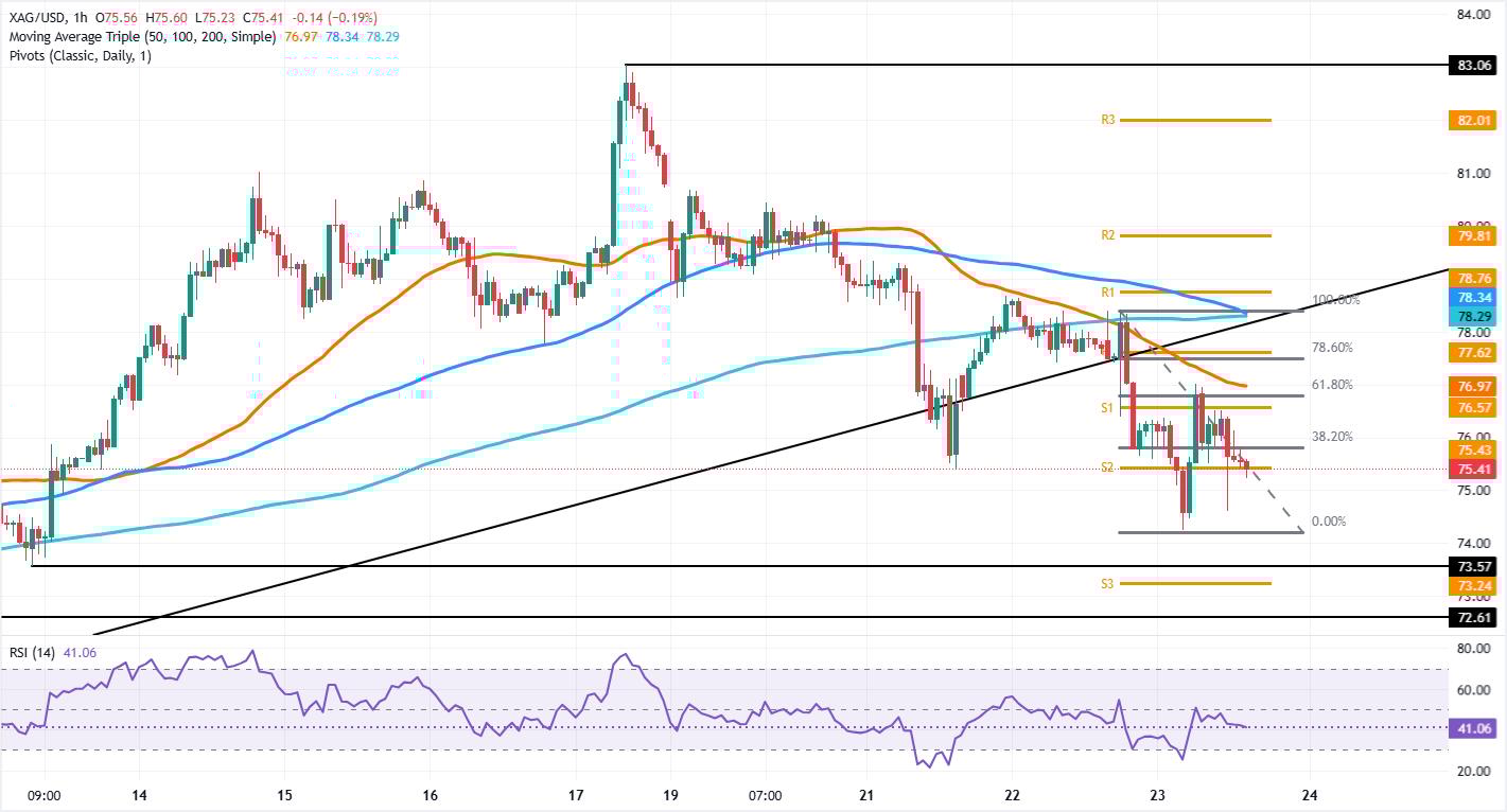 由于地缘政治新闻主导周四的价格走势,银价买盘(XAG/USD)在50日简单移动均线(SMA)78.73美元处受阻后暴跌。XAG/USD报75.40美元,下跌3%。