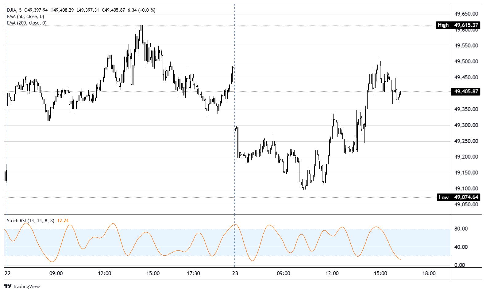 道琼斯工业平均指数(DJIA)期货周四徘徊在49,400附近,盘中在49,100至49,600之间波动后,现交易略低于平盘线。