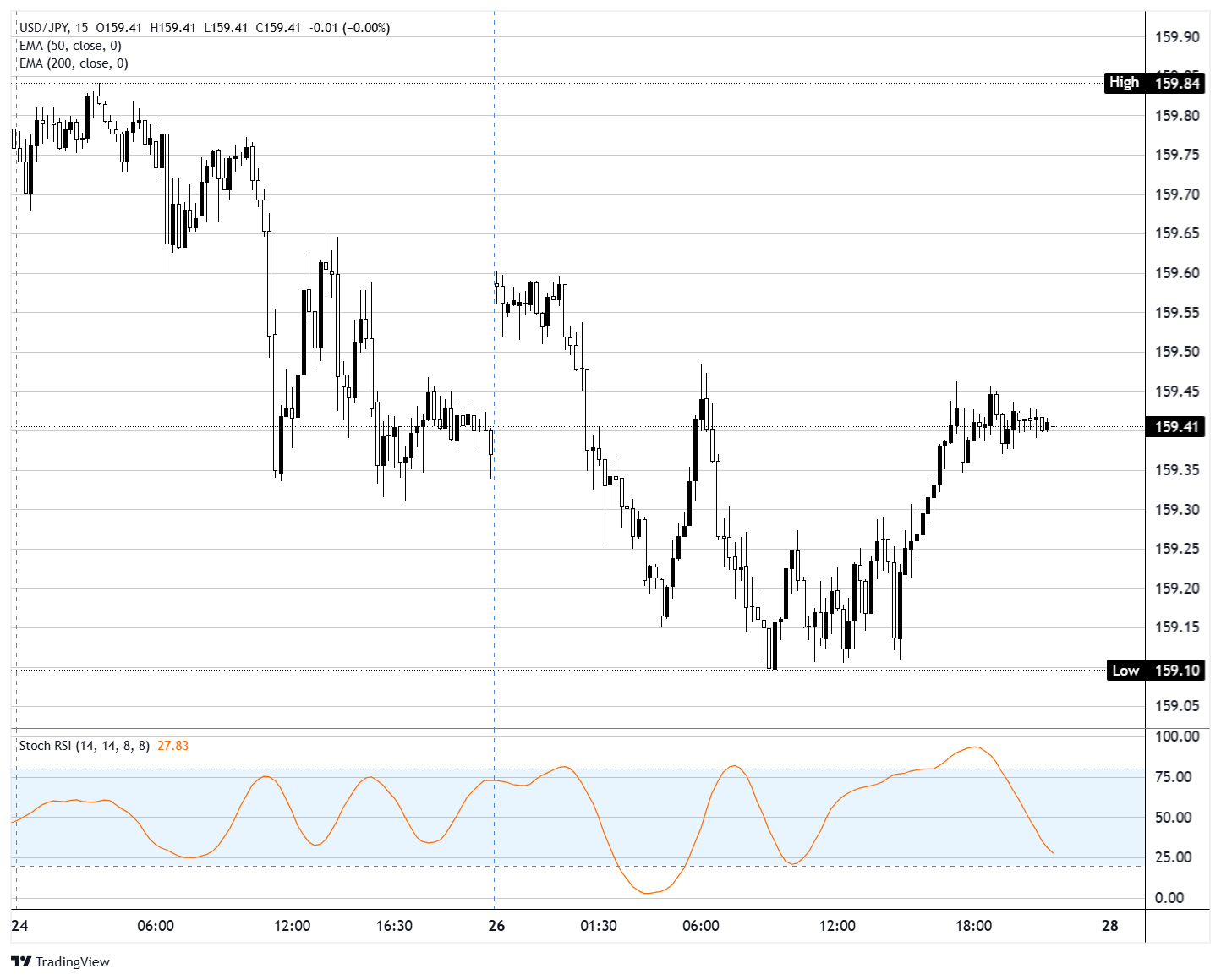 美元/日元周一基本保持不变,与周五的收盘报价接近159.40,在159.10至159.85之间的75点窄幅区间内波动。该交易时段产生了一系列小实体蜡烛,反映出在周二日本央行(BoJ)决议前的不确定性