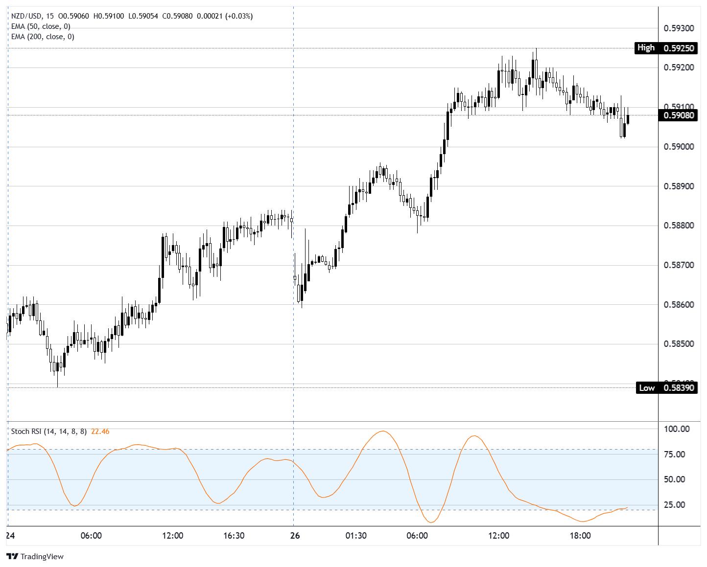 周一,纽元/美元小幅上涨约0.4%,收于接近0.5905,但停滞在限制上周反弹的0.5925区域下方。
