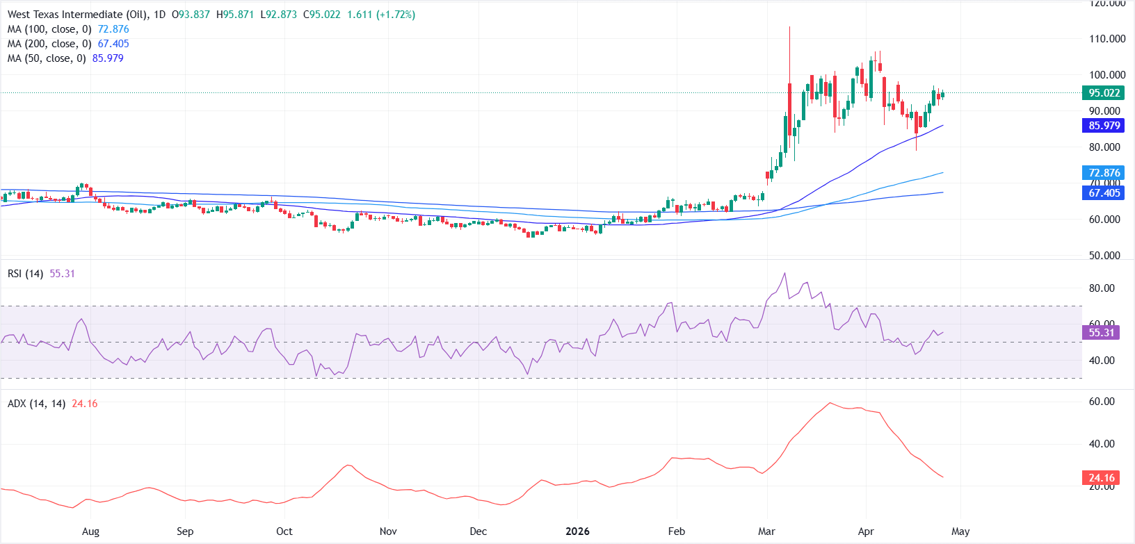 周一,西德克萨斯中质原油(WTI)保持稳定,因美伊和平谈判陷入僵局,降低了霍尔木兹海峡近期重新开放的希望。撰稿时,WTI交投于每桶约95.00美元,地缘政治新闻的变化使波动性保持在较高水平。